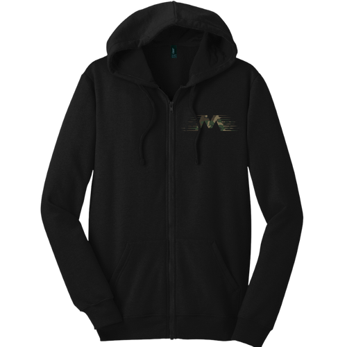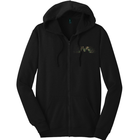 This hoodie is printed on an District black zip up garment which comes in sizes Small thru 4X. This one fits great but is not oversized or loose fitting, so size accordingly!