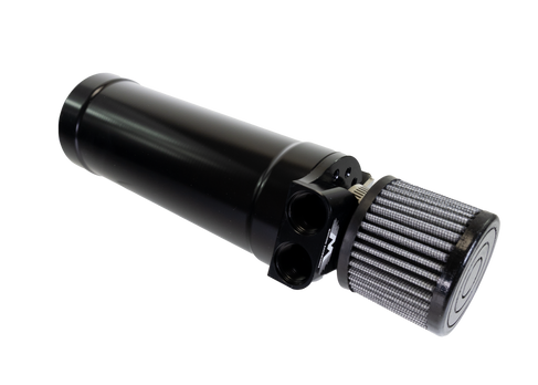 Baffling of the top loader catch can offers to knock down events to keep oil out of the filter. While extreme cases can still fill up the catch can and potentially saturate the filter, our catch can design is made to separate the oil from your crank case evacuation and remove the pressure out the top of the catch can through the filter. Many race style catch cans on the market are simply fittings into a hollow can which offers little ability for the oil to be knocked out of the air resulting in an oily filter, our catch can nearly always prevents that from happening.