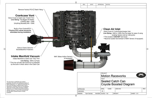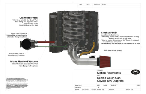 Plumb an active catch can into your F150 Coyote with this Motion Raceworks catch can kit. The Motion Raceworks active catch can kit is designed to create the best of both worlds when it comes to PCV. Our Active two stage catch can acts as a sealed system under normal driving conditions featuring a PCV check valve as well as an active valve on the top. This means that under normal driving the crank case pressure will flow through the engine and oil will collect in the can by knocking oil out of the crank case pressure charge. This is accomplished using a complex baffling system and vacuum source from the engine to draw fresh air through one side of the valve cover (filtered by an filter intake pipe like factory), out the other valve cover and into the catch can.